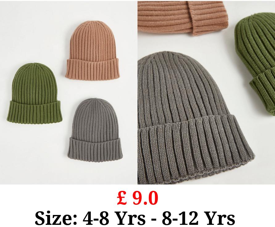 £ 9.0 Ribbed Knitted Beanies 3 Pack