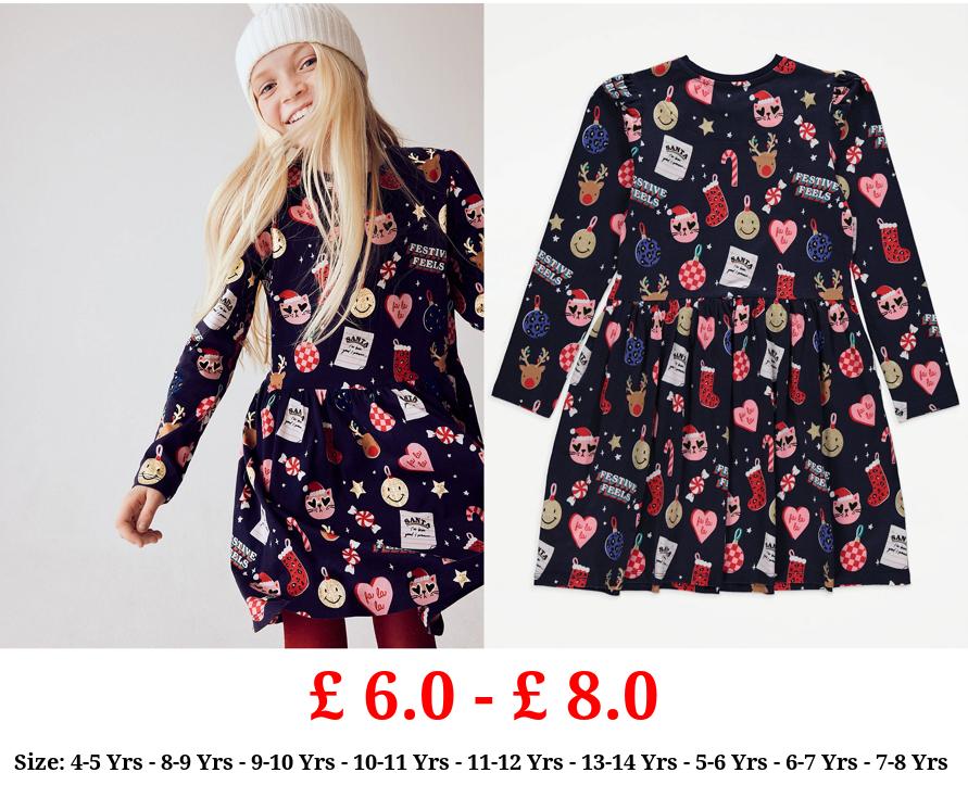 £ 6.0 - £ 8.0 Navy Fun Christmas Print Skater Dress