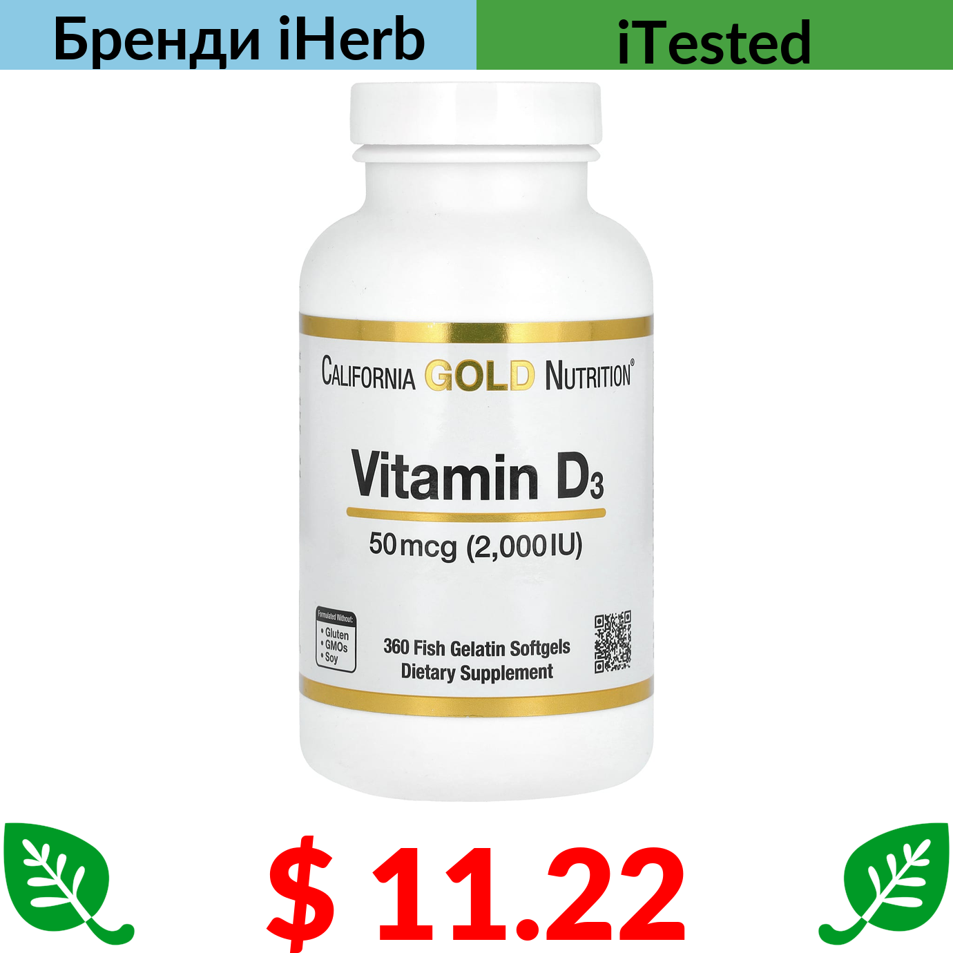 $ 11.22 California Gold Nutrition, вітамін D3, 50 мкг (2000 МО), 360 капсул із риб’ячого желатину