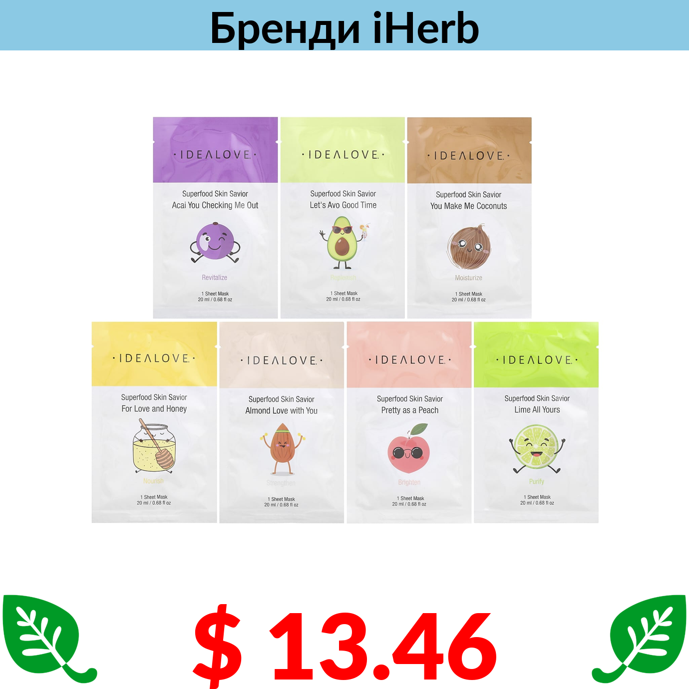 $ 13.46 Idealove, Superfood Skin Savior, 7 тканинних масок для краси по 20 мл (0,68 рідк. унції)