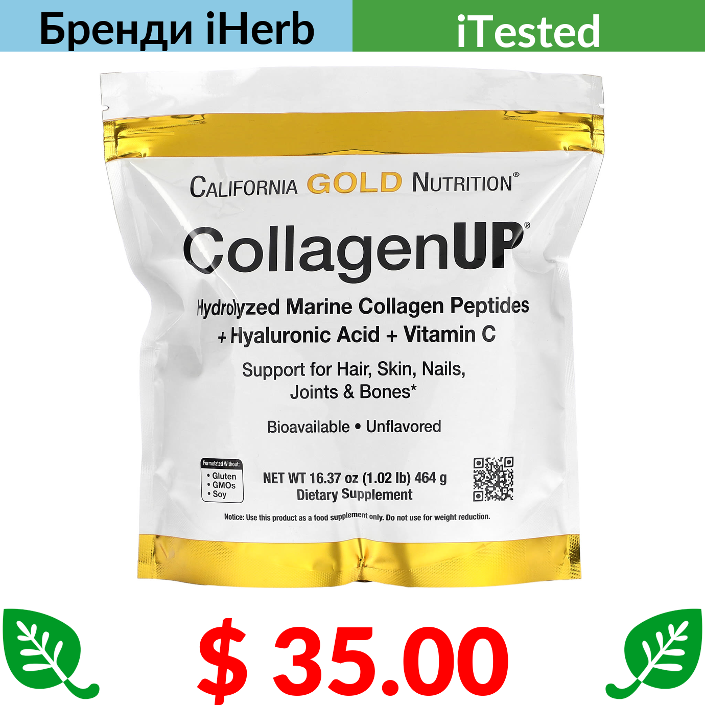 $ 35.00 California Gold Nutrition, CollagenUP, морський гідролізований колаген, гіалуронова кислота й вітамін С, без добавок, 464 г (16,37 унції)