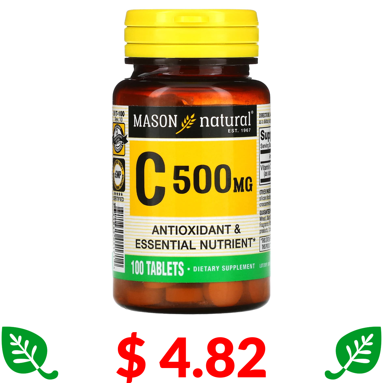 $ 4.82 Mason Natural, вітамін C, 500 мг, 100 таблеток