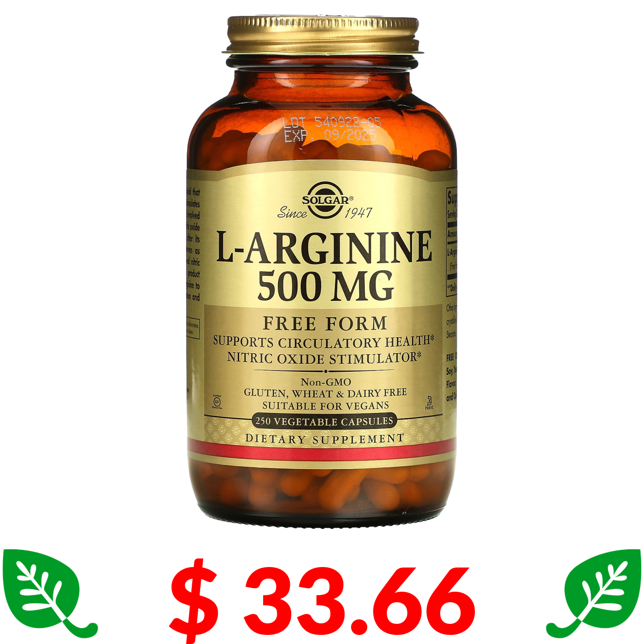 $ 33.66 Solgar, L-Arginine, Free Form, 500 mg, 250 Vegetable Capsules