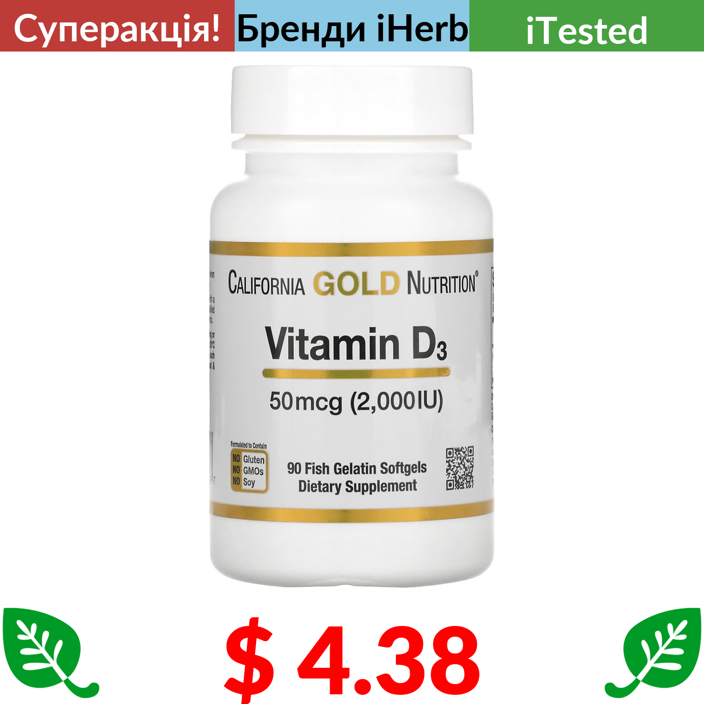 $ 4.38 California Gold Nutrition, вітамін D3, 50 мг (2000 МО), 90 капсул із риб’ячого желатину
