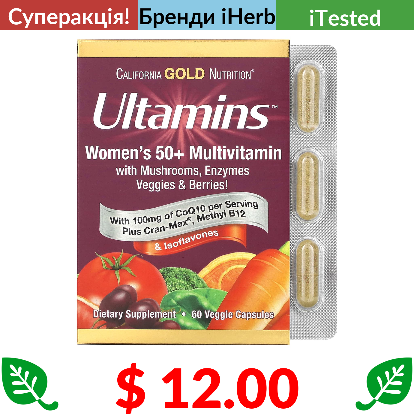 $ 12.00 California Gold Nutrition, Ultamins, мультивітаміни для жінок старше 50 років із коензимом Q10, гриби, ферменти, овочі та ягоди, 60 вегетаріанських капсул