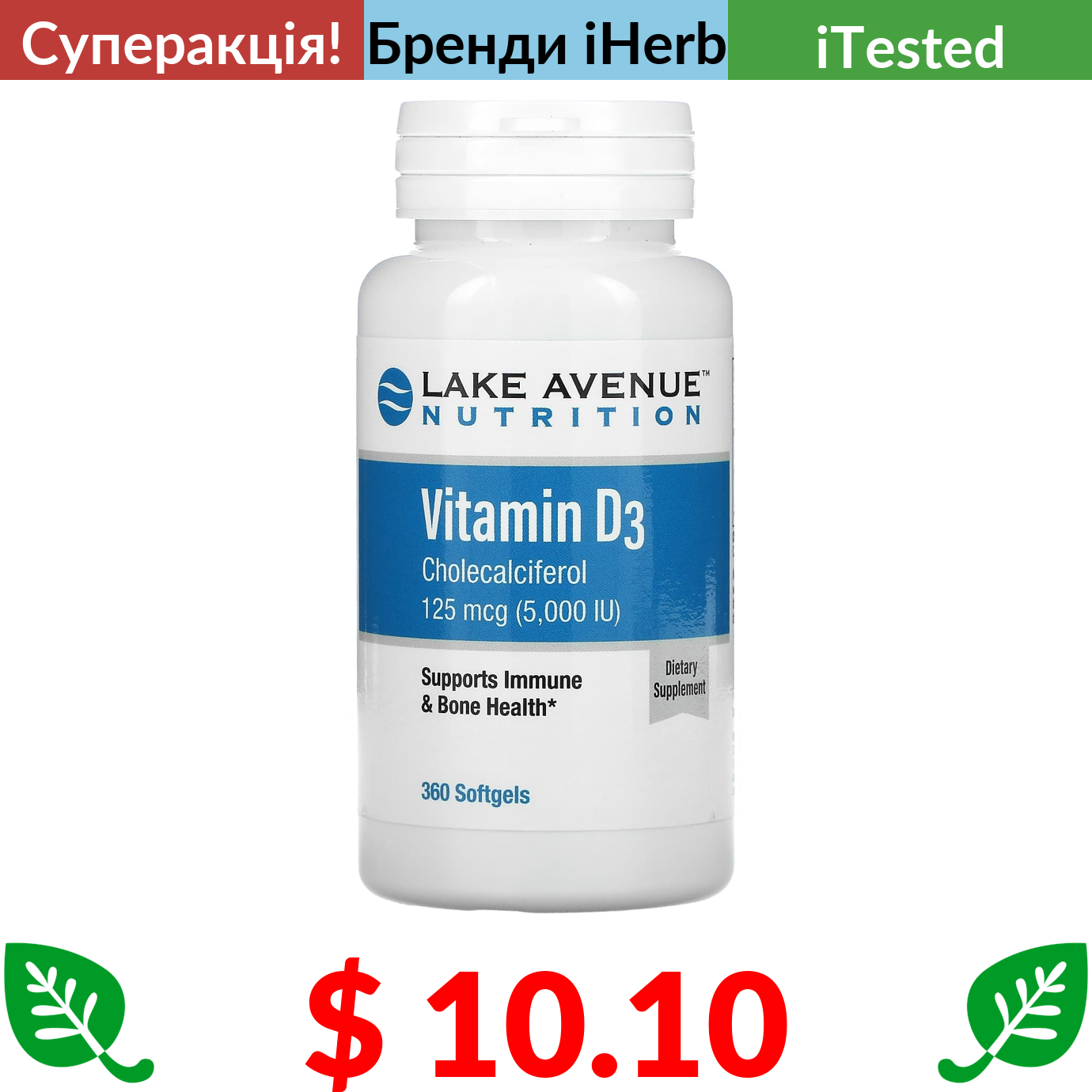 $ 10.10 Lake Avenue Nutrition, вітамін D3, 125 мкг (5000 МО), 360 капсул