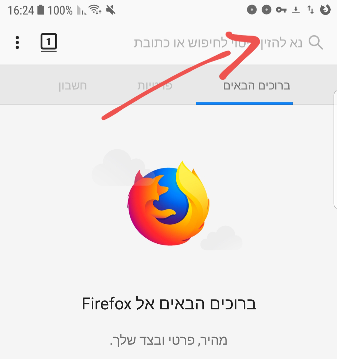לאחר מכן יש לבצע חיבור באפליקציית נטפרי או נטספארק, להיכנס לדפדפן פיירפוקס וללחוץ על שורת הכתובת (URL) למעלה כפי המתואר בתמונה: