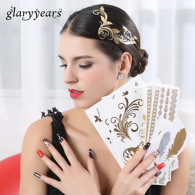 Kiamoo Art Design Store Cheap 1 Sheet Fashion Decal Gold Silver Star Flash Metallic Tatoo Women Hair Body Art HT300 Temporary Tattoo Jewelry Charm Sticker, High Quality Temporary Tattoos from Kiamoo Art Design StoreQR Code