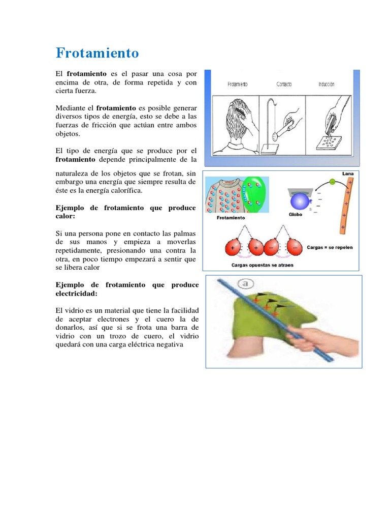 Frotamiento o fricción - Física 2 . Cuando se realiza el frotamiento o la fricción entres dos cuerpos, sucede: Ejemplos: Al acariciar un conejo o gato, se electriza su piel . Al descender por una resbaladilla se produce una chispa al tocar la mano de algún compañero . Cuando se da esa chispa, lo que sucede es que por el frotamiento se ha . . .