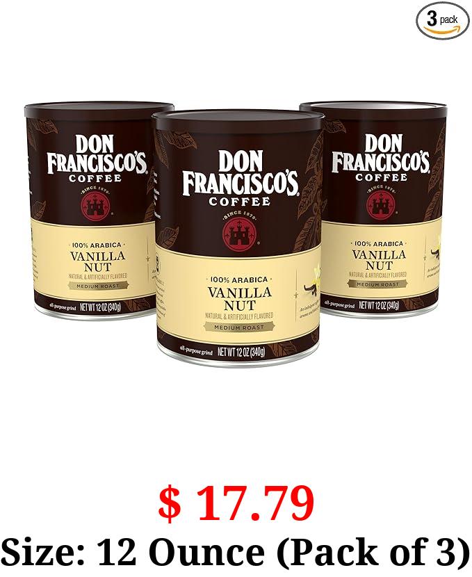 $ 17.79 Size: 12 Ounce (Pack of 3) Don Francisco's Vanilla Nut Flavored Ground Coffee (3 x12 oz Cans)