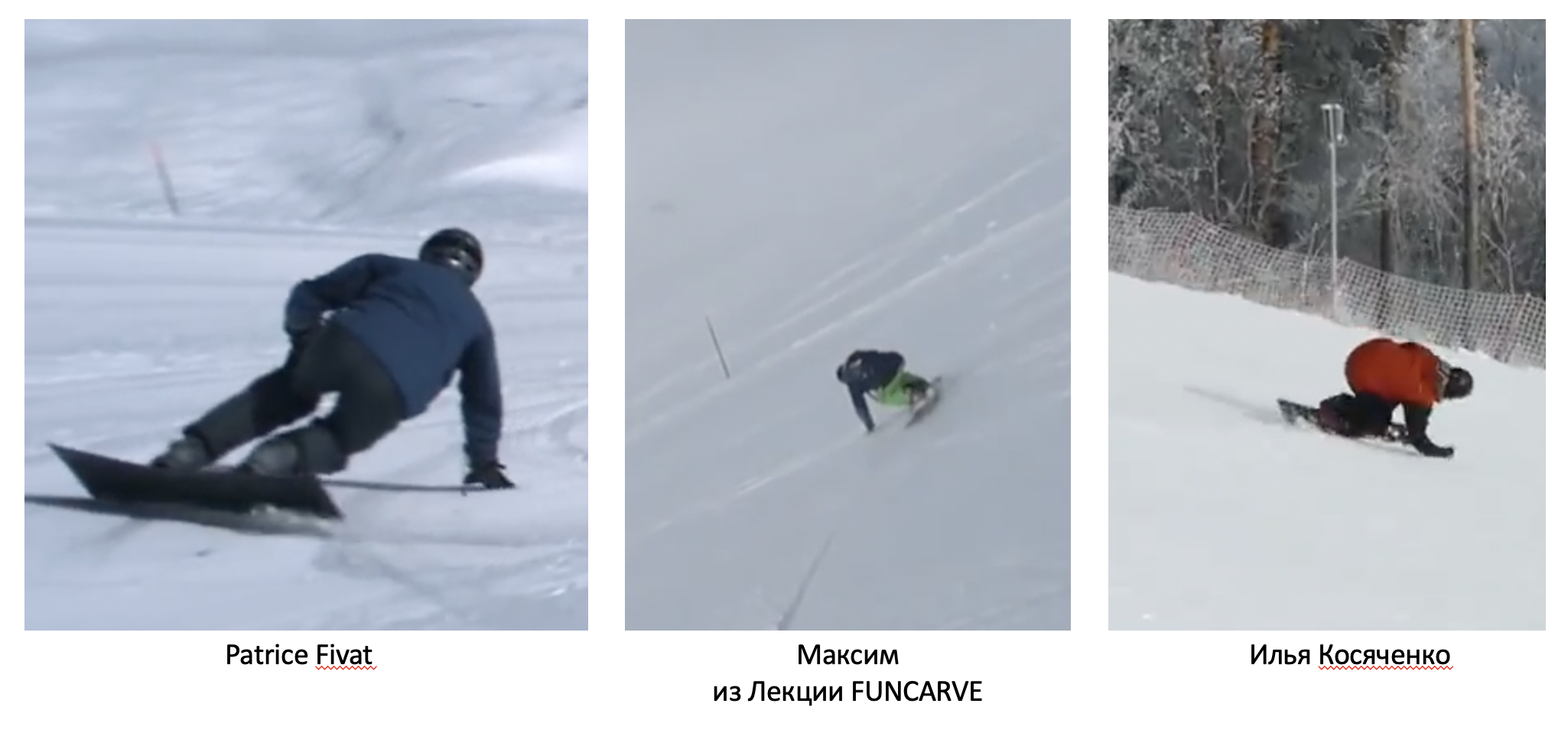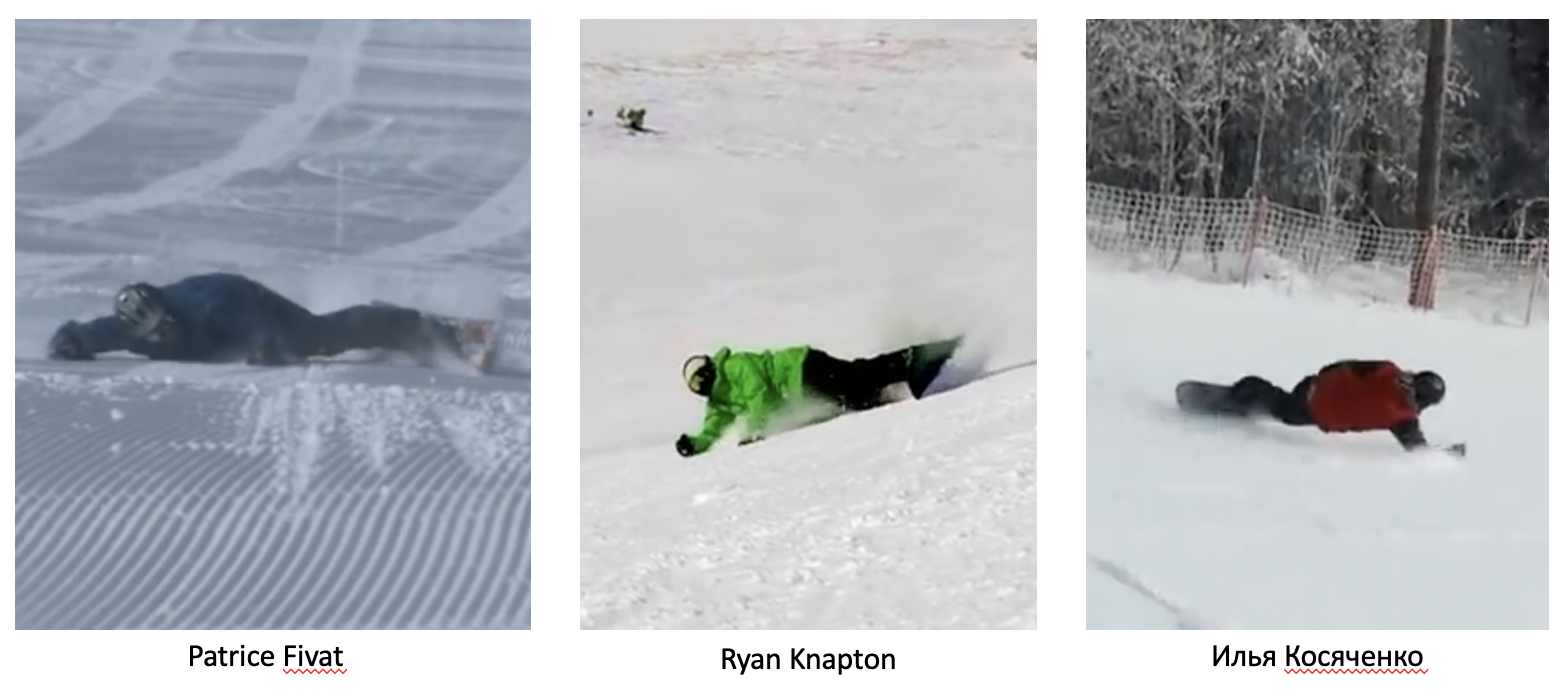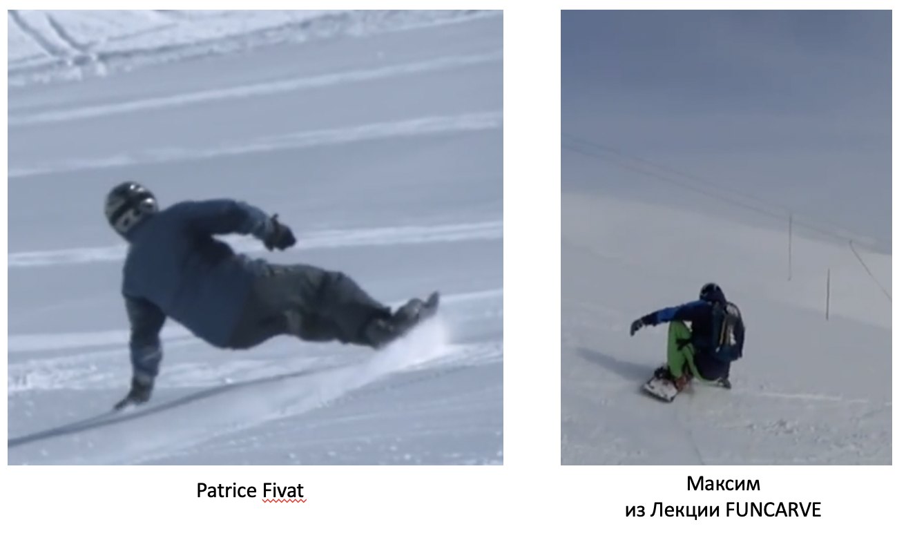 1. Обратите внимание на углы закантовки досок. Patrice увеличивает угол закантовки доски, и как следствие – кладет руку на склон; остальные кладут руку на склон и, получив третью точку опоры (которой нет в оригинале), увеличивают угол закантовки доски.