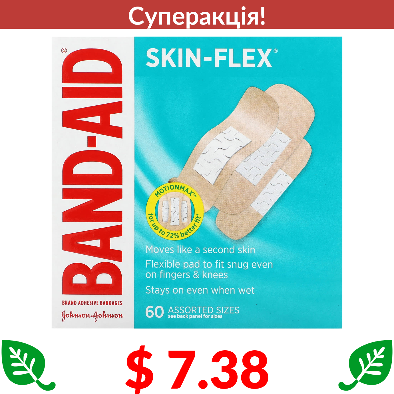 $ 7.38 Band Aid, пластирі, Skin-Flex, різні розміри, 60 шт