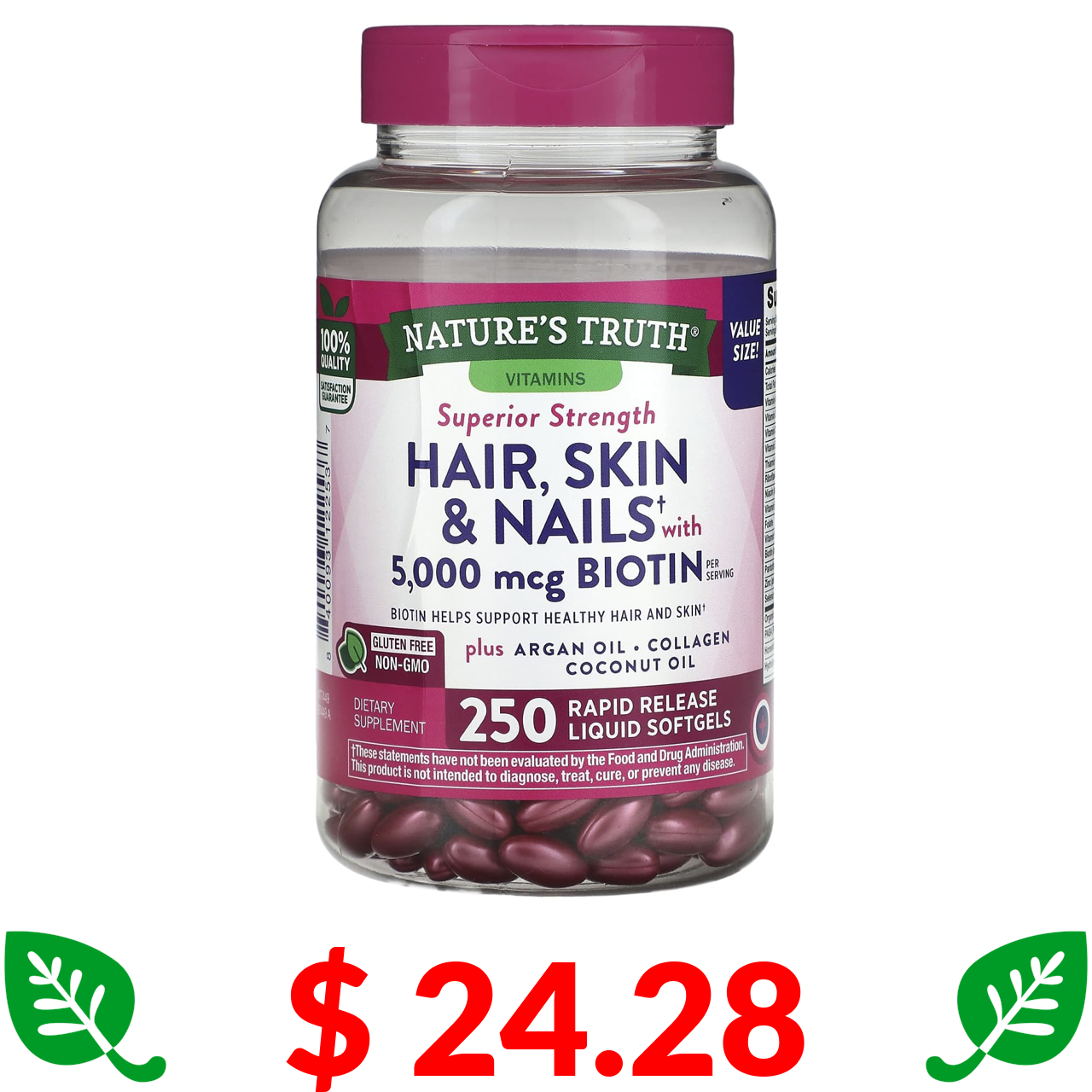 $ 24.28 Nature's Truth, добавка для волосся, шкіри та нігтів із біотином, 250 капсул із рідиною для швидкого вивільнення