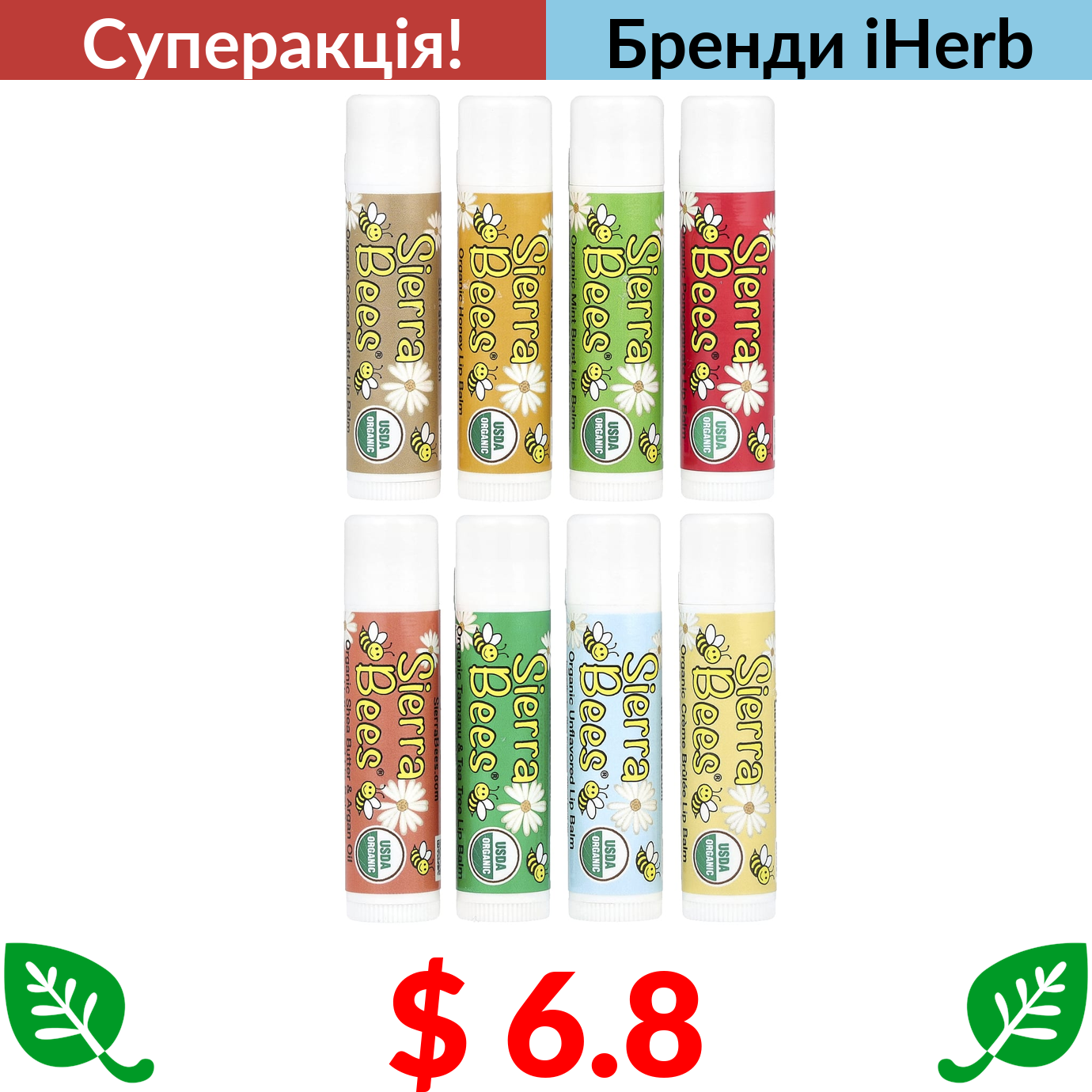 $ 6.8 Sierra Bees, набір органічних бальзамів для губ, 8 шт,. по 4,25 г (0,15 унції)