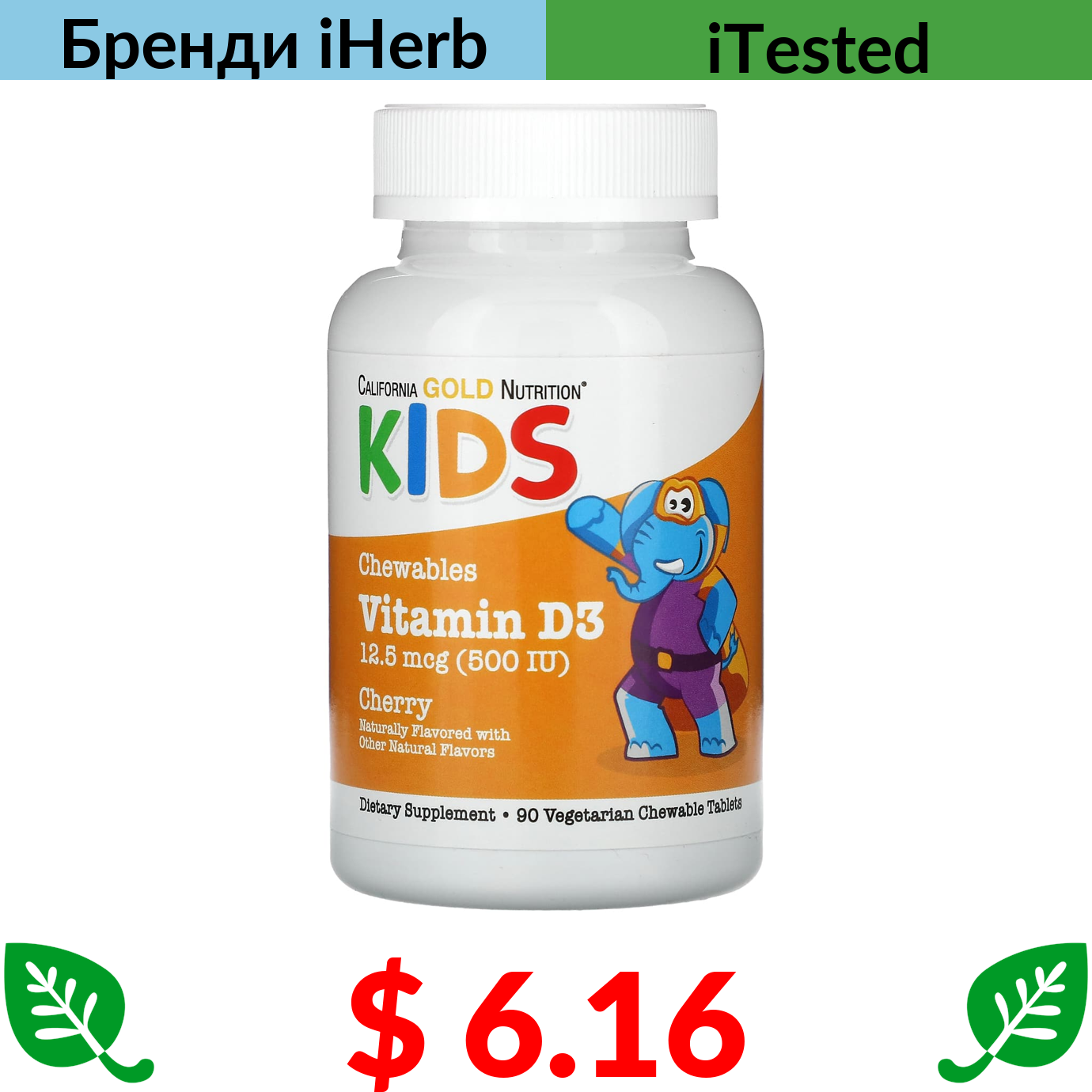 $ 6.16 California Gold Nutrition, жувальний вітамін D3 для дітей, зі смаком натуральної вишні, 12,5 мкг (500 МО), 90 вегетаріанських таблеток