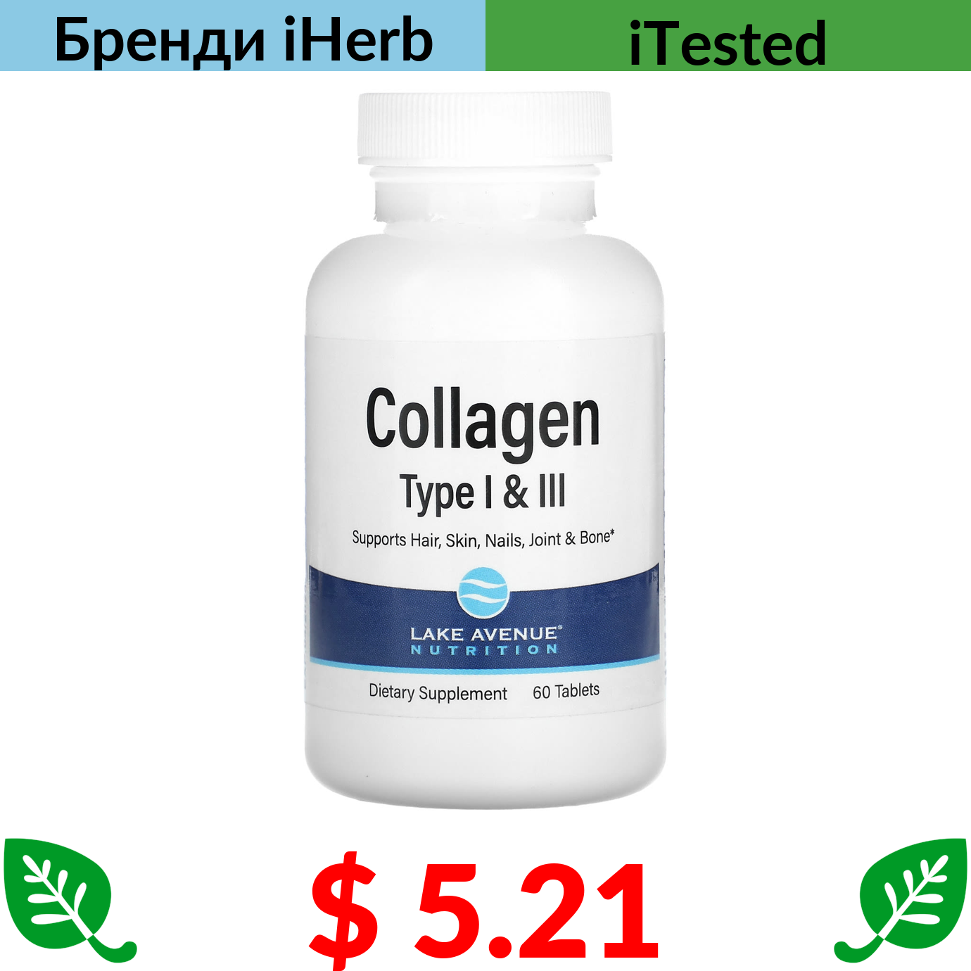 $ 5.21 Lake Avenue Nutrition, гідролізований колаген I й III типів, 3000 мг, 60 таблеток (1000 мг у таблетці)
