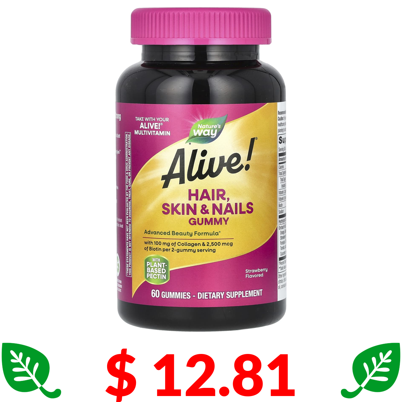 $ 12.81 Nature's Way, Alive! жувальні таблетки для здоров’я волосся, шкіри та нігтів, зі смаком полуниці, 60 жувальних таблеток