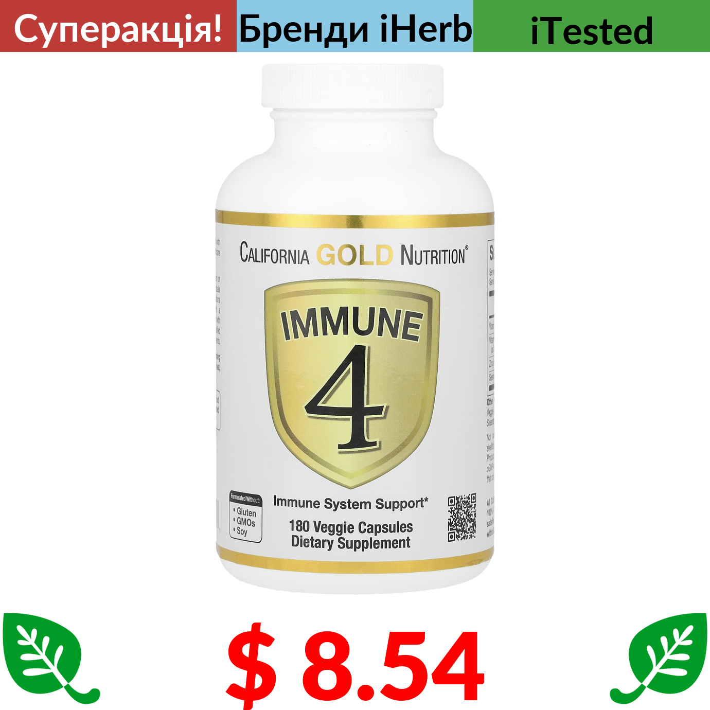 $ 8.54 California Gold Nutrition, Immune 4, засіб для зміцнення імунітету, 180 вегетаріанських капсул