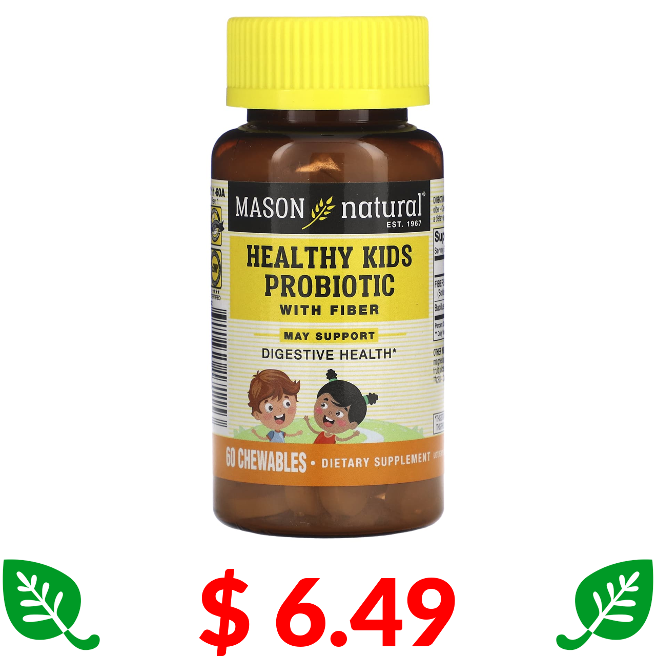 $ 6.49 Mason Natural, пробіотик із клітковиною для здоров’я дітей, 60 жувальних таблеток