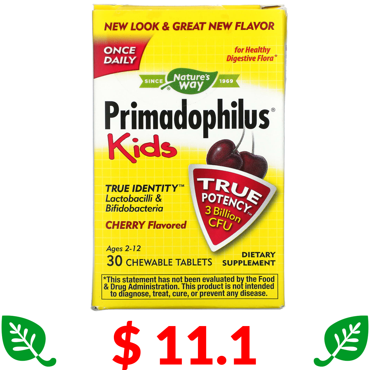 $ 11.1 Nature's Way, Primadophilus, Kids, Age 2-12, Cherry , 3 Billion CFU, 30 Chewable Tablets