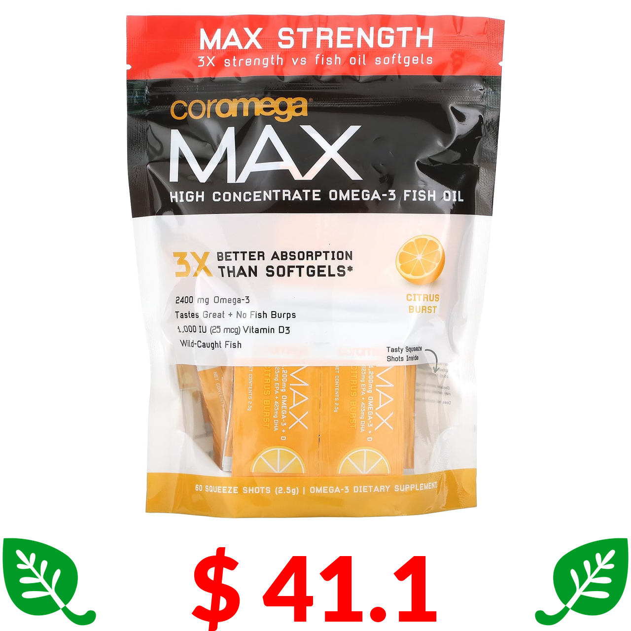 $ 41.1 Coromega, Max, High Concentrate Omega-3 Fish Oil, Citrus Burst, 60 Squeeze Shots, (2.5 g) Each