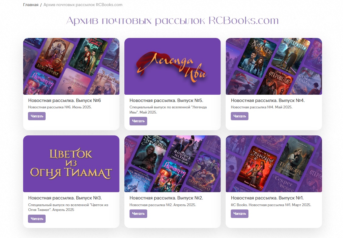 Регулярно, два раза в месяц, всем зарегистрированным пользователям на электронную почту приходят рассылки от сайта RC Books. Помимо эксклюзивных материалов от авторов RC Books, актёров студий озвучки и сценаристов и художников Клуба Романтики, в рассылках вы можете найти уникальные обои с иллюстрациями от лучших художников КР, а также стать участниками закрытых розыгрышей призов — только для получателей рассылок.