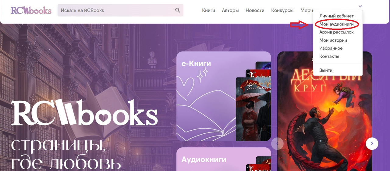 Есть другой вариант — войти в каталог через вкладку Мои аудиокниги в выпадающем меню вашего аккаунта. Как понятно из названия вкладки, она ведёт в каталог только аудиокниг, но из этого раздела удобно возвращаться к прослушиванию книги на том моменте, на котором вы остановились ранее.