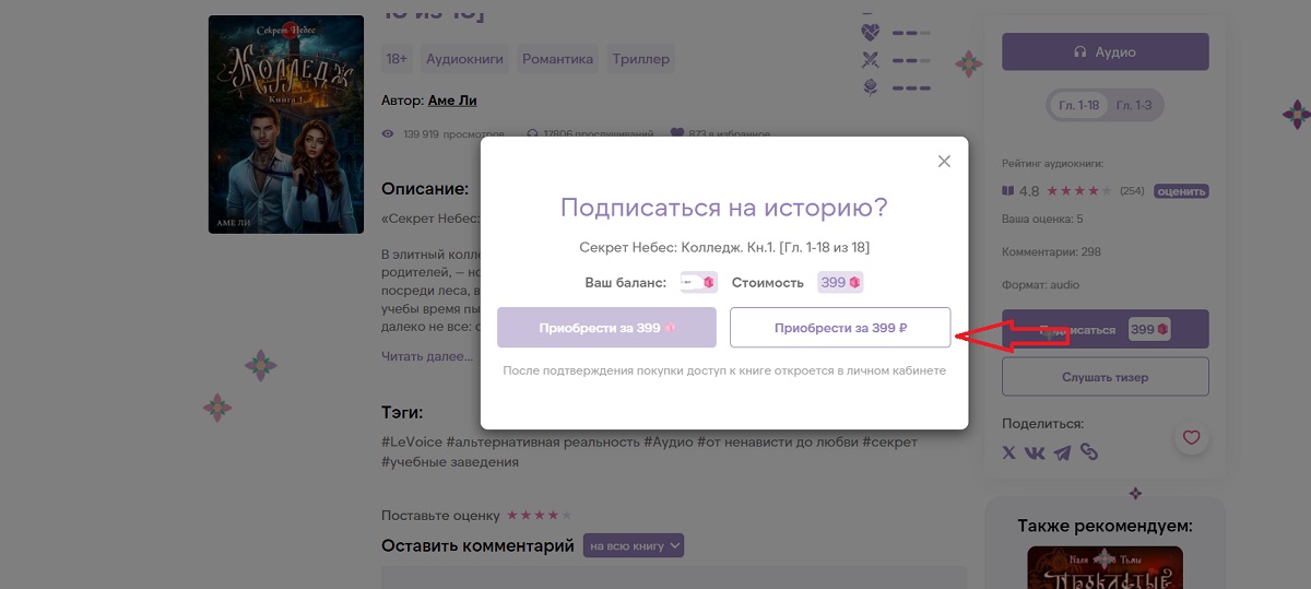 Следующая стрелочка (2) — это выбор между ознакомительными главами, которые вы можете приобрести всего за 1 сапфир, и подпиской на полное произведение. В нашем примере мы выбрали полную подписку.