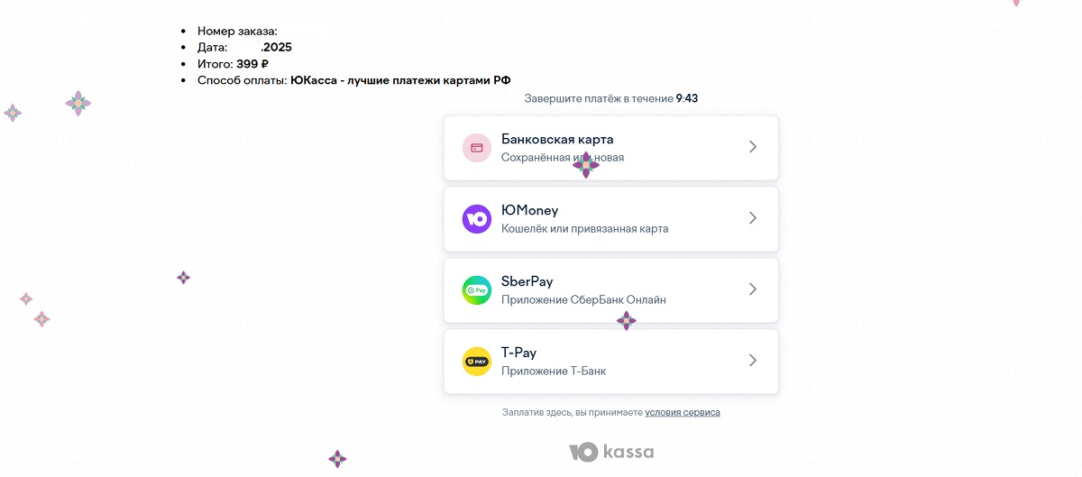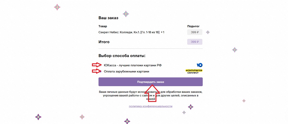 Мы выбрали вариант оплаты, и перед нами окно оплаты заказа. Как видите, оплатить можно картой любого банка – российского или банков других стран. Если у вас карта российского банка, выбирайте пункт меню «ЮКасса» (это не какое-то специальное приложение, которое должно у вас быть, это платёжный сервис). Если же вы находитесь в другой стране или у вас платёжная карта банка другой страны, выбирайте пункт меню «Оплата зарубежными картами». Далее нажимаем «Подтвердить заказ».