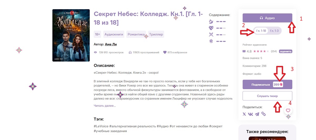 Самая нижняя стрелочка (4) указывает на кнопку «Слушать тизер». За тизер платить не нужно, если нажать на кнопку, можно услышать бесплатный рекламный ролик книги.