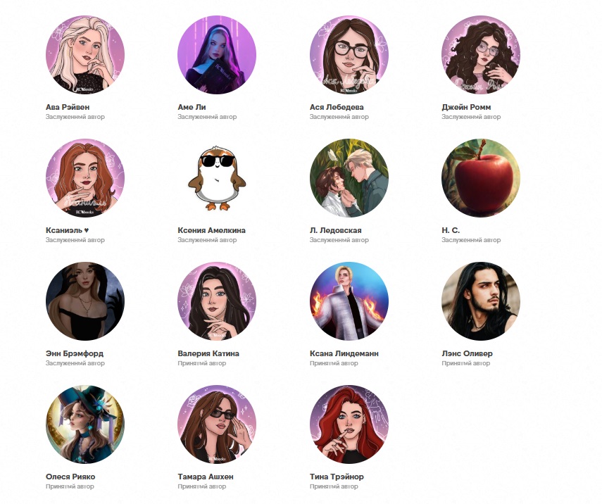 На главной странице сайта в верхнем меню ищем вкладку Авторы. Кликаем на неё и попадаем в каталог авторов RC Books и сценаристов Клуба Романтики, новеллами которых вдохновлялись при написании своих произведений авторы.