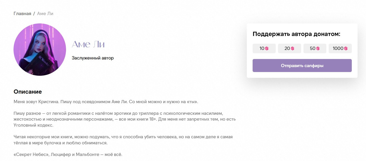 Сапфиры можно копить, чтобы потом использовать при оплате подписки на выбранную книгу, а ещё сапфиры можно задонатить любимым авторам RC Books. Им будет приятно, и все подаренные им читателями сапфиры они смогут монетизировать.