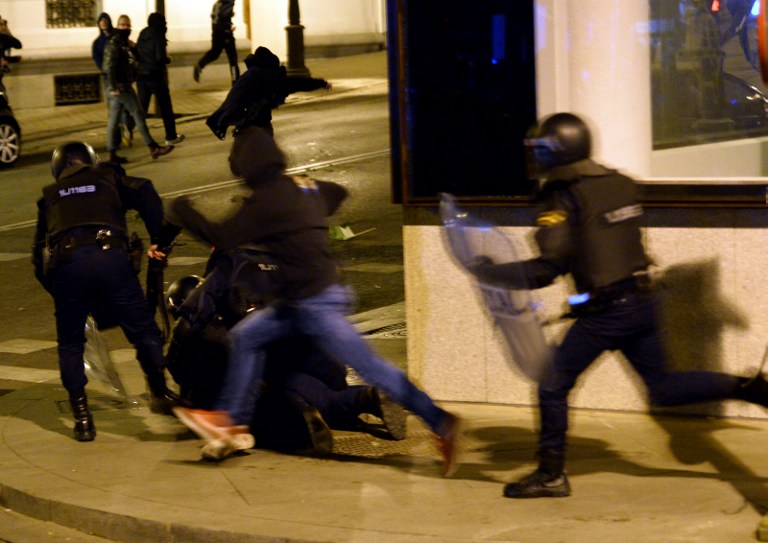 Madrid'deki gösteri olaylı bitti . Gösteri sonrasında bir grup, iktidardaki Halk Partisi'nin merkez binasının olduğu ve güvenlik önleminden dolayı kapatılan sokağa yürümek isteyince polisin . . .