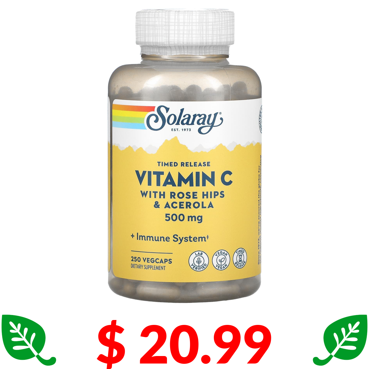 $ 20.99 Solaray, вітамін C повільного вивільнення, з шипшиною й ацеролою, 500 мг, 250 капсул VegCaps