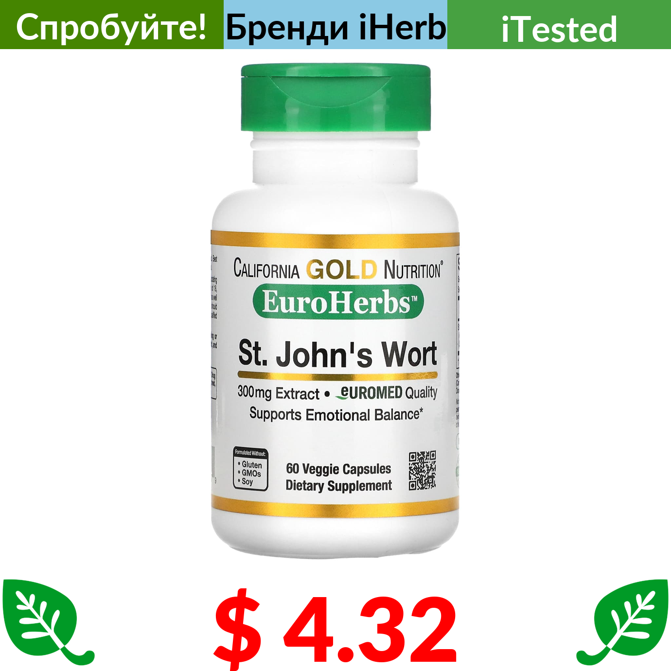 $ 4.32 California Gold Nutrition, EuroHerbs, екстракт звіробою, європейська якість, 300 мг, 60 рослинних капсул