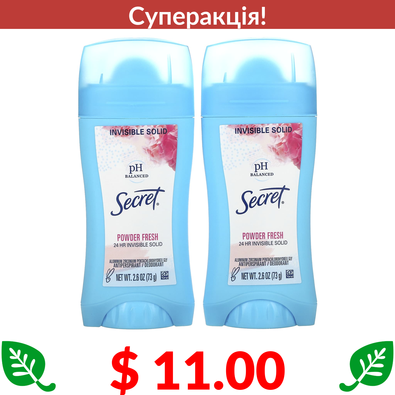 $ 11.00 Secret, твердий антиперспірант/дезодорант зі збалансованим рівнем pH, невидимий захист, свіжий пудровий аромат, два продукти по 73 г (2,6 унції)