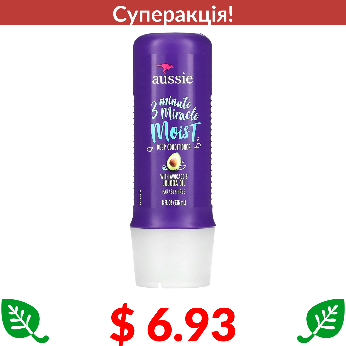 $ 6.93 Aussie, 3 Minute Miracle Moist, кондиціонер для глибокого зволоження з авокадо та олією австралійського жожоба, 236 мл (8 рідк. унцій)