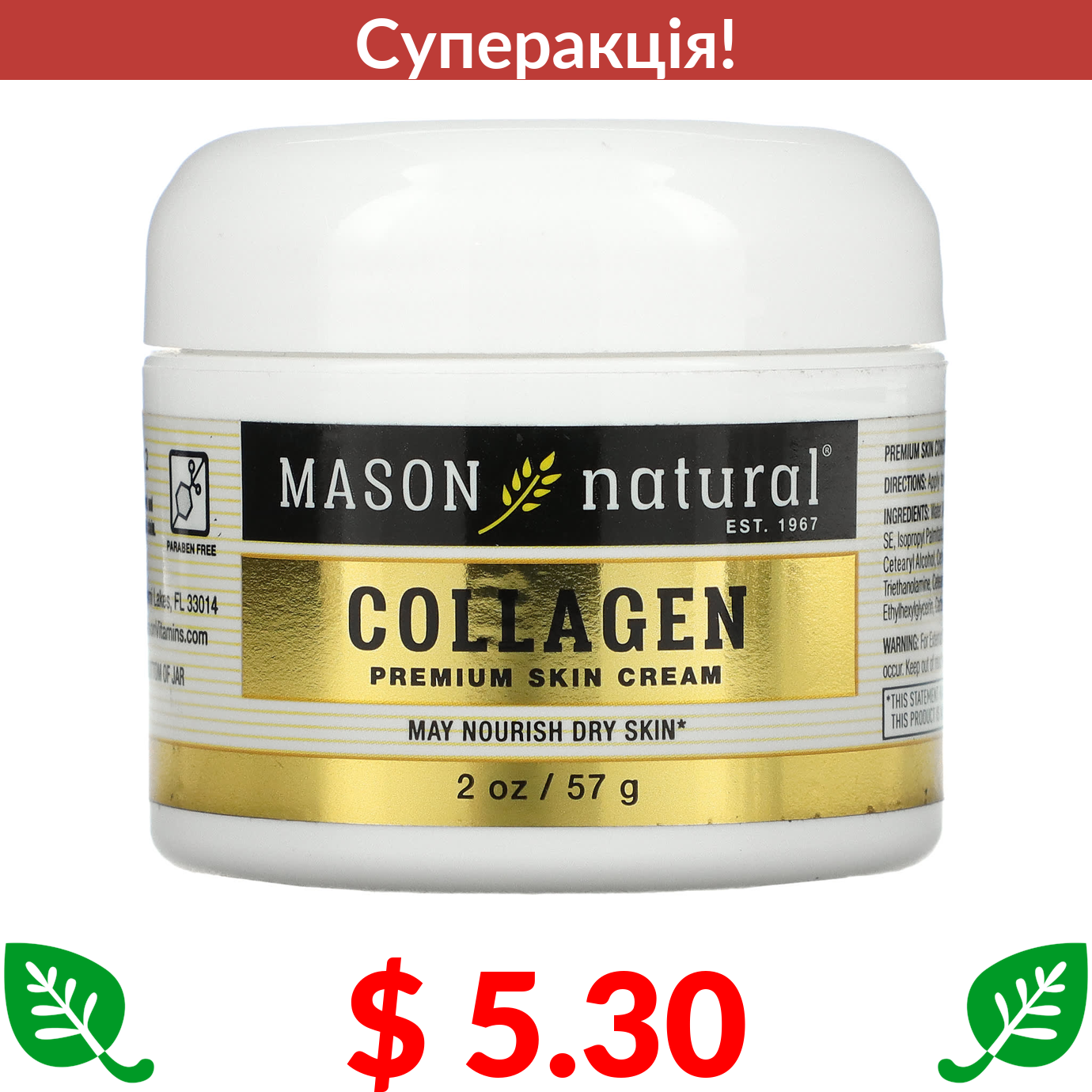 $ 5.30 Mason Natural, крем для шкіри з колагеном преміальної якості, 57 г (2 унції)