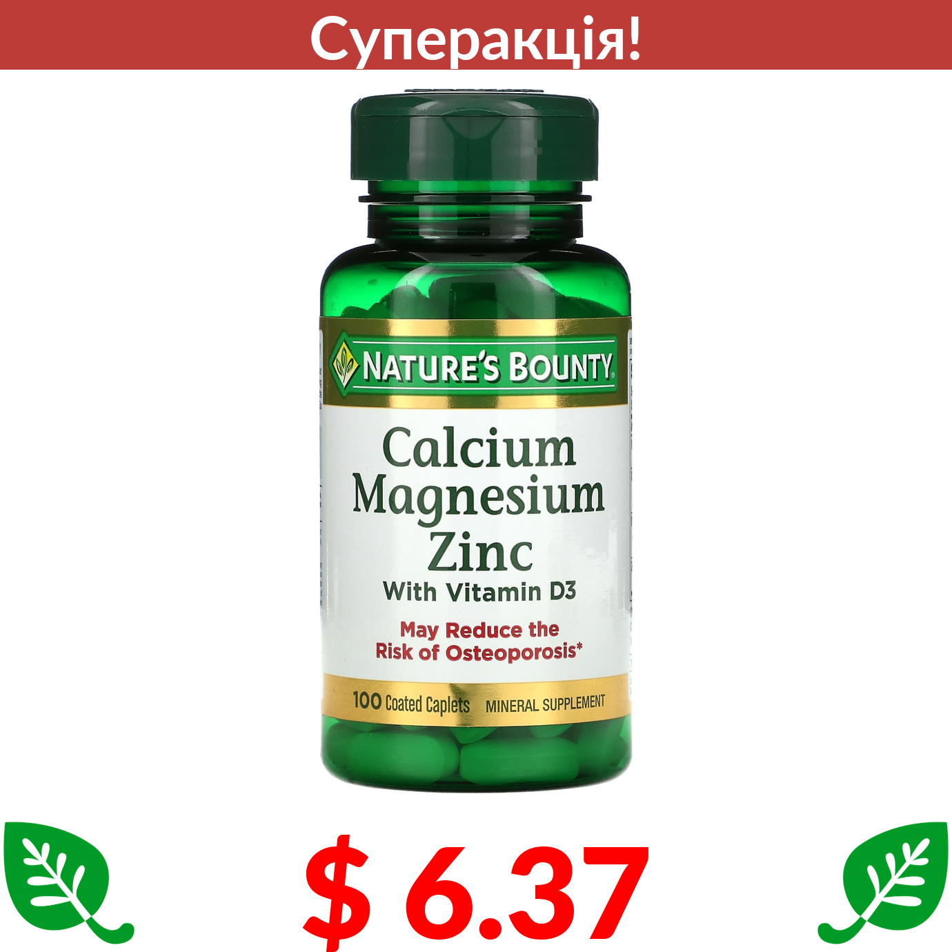 $ 6.37 Nature's Bounty, кальцій, магній та цинк, з вітаміном D3, 100 капсул в оболонці