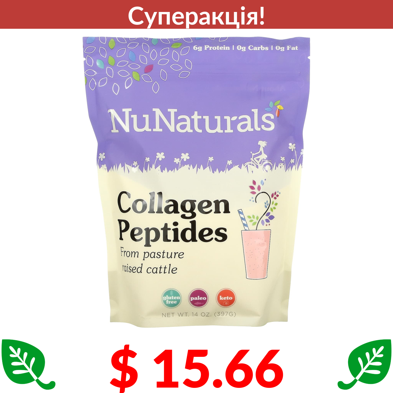 $ 15.66 NuNaturals, пептиди колагену, 397 г (14 унцій)