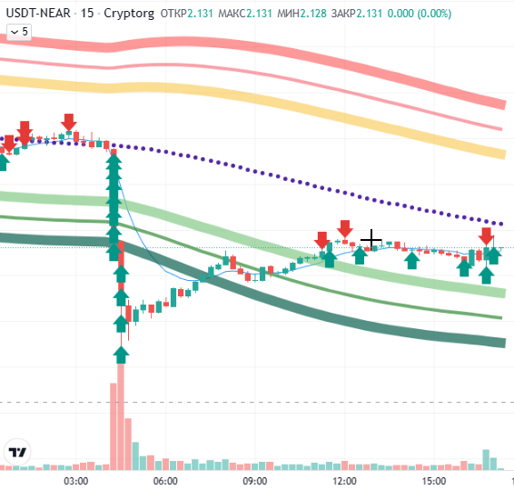 7. Период EMA - чем он меньше, тем чаще поступают сигналы на запуск ботов. Сигналы формируются по принципам “пересечение вверх - лонг”, “пересечение вниз - шорт” Внимание! Если цена находится внутри ЦО, то шорт может запуститься в локальном минимуме, а лонг - в локальном максимуме, учитывайте это при настройке сетки СО в боте.