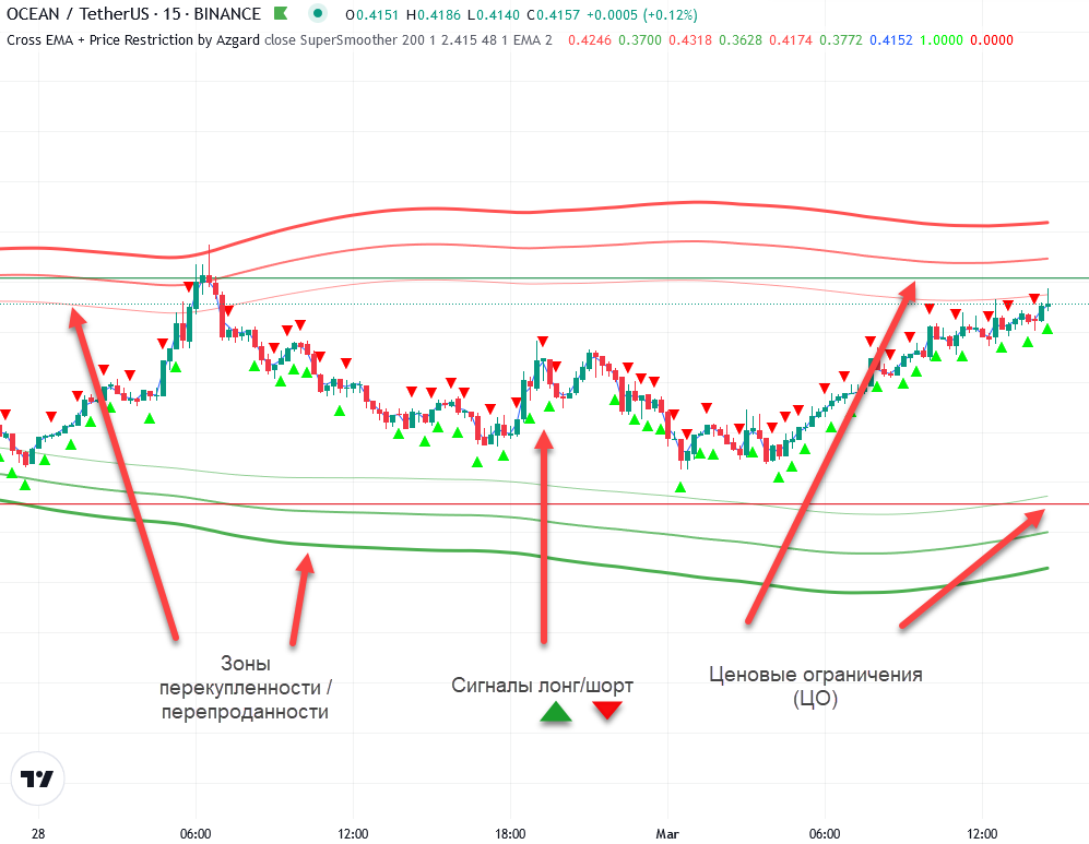 Также это индикатор с настраиваемыми ценовыми ограничениями на работу ботов, чтобы избавить от необходимости вручную периодически корректировать ЦО. ЦО необходимы для того, чтобы не запускались лонговые боты выше определенной цены, т. е. на пиках (хаях), и, соответственно, шортовые боты не запускались ниже определенных цен на падениях (лоях).