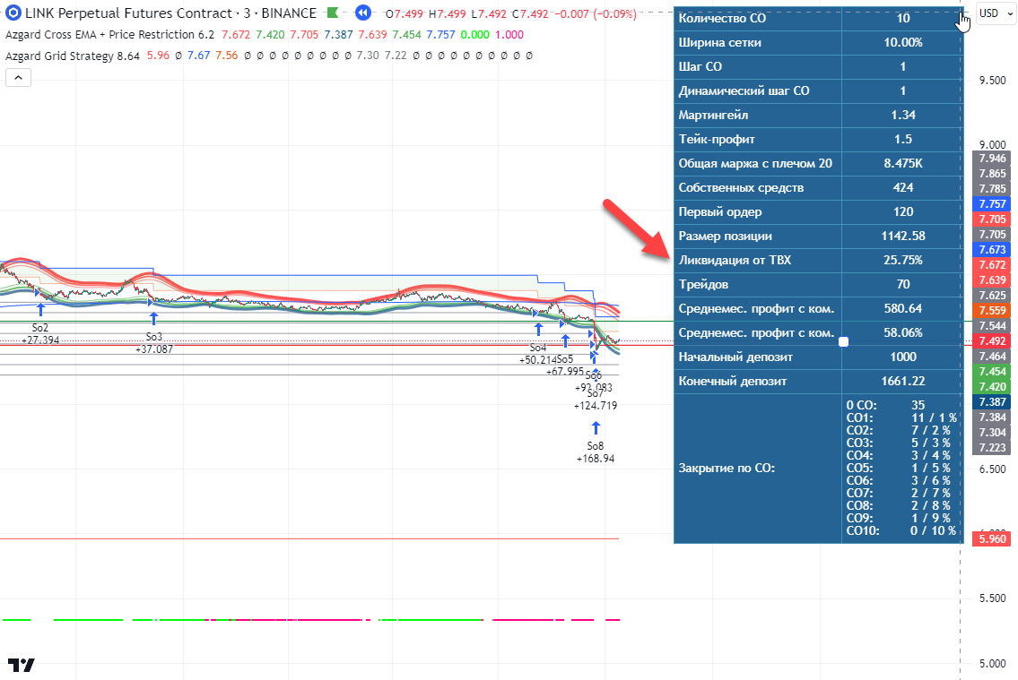 2) Добавлен режим "выше/ниже МА", при котором выдаются сигналы, находящиеся в канале, и одновременно выше или ниже указанной MA. Это может дать интересные результаты (обратите внимание на расстояние до ликвидации!):