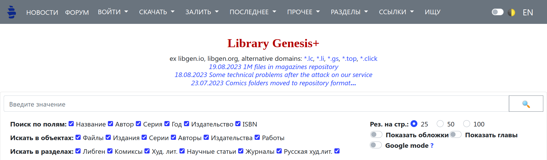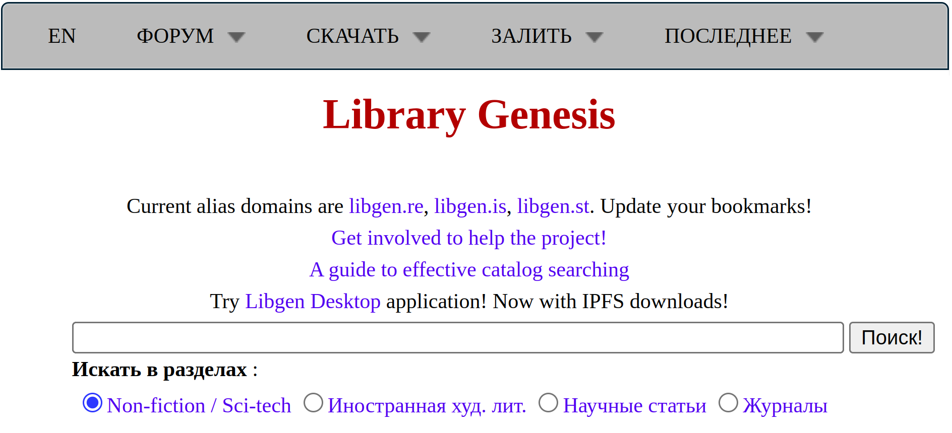 Вы должны оказаться на странице, похожей на одно из двух приведённых ниже изображений — это главная поисковая страница Library Genesis.