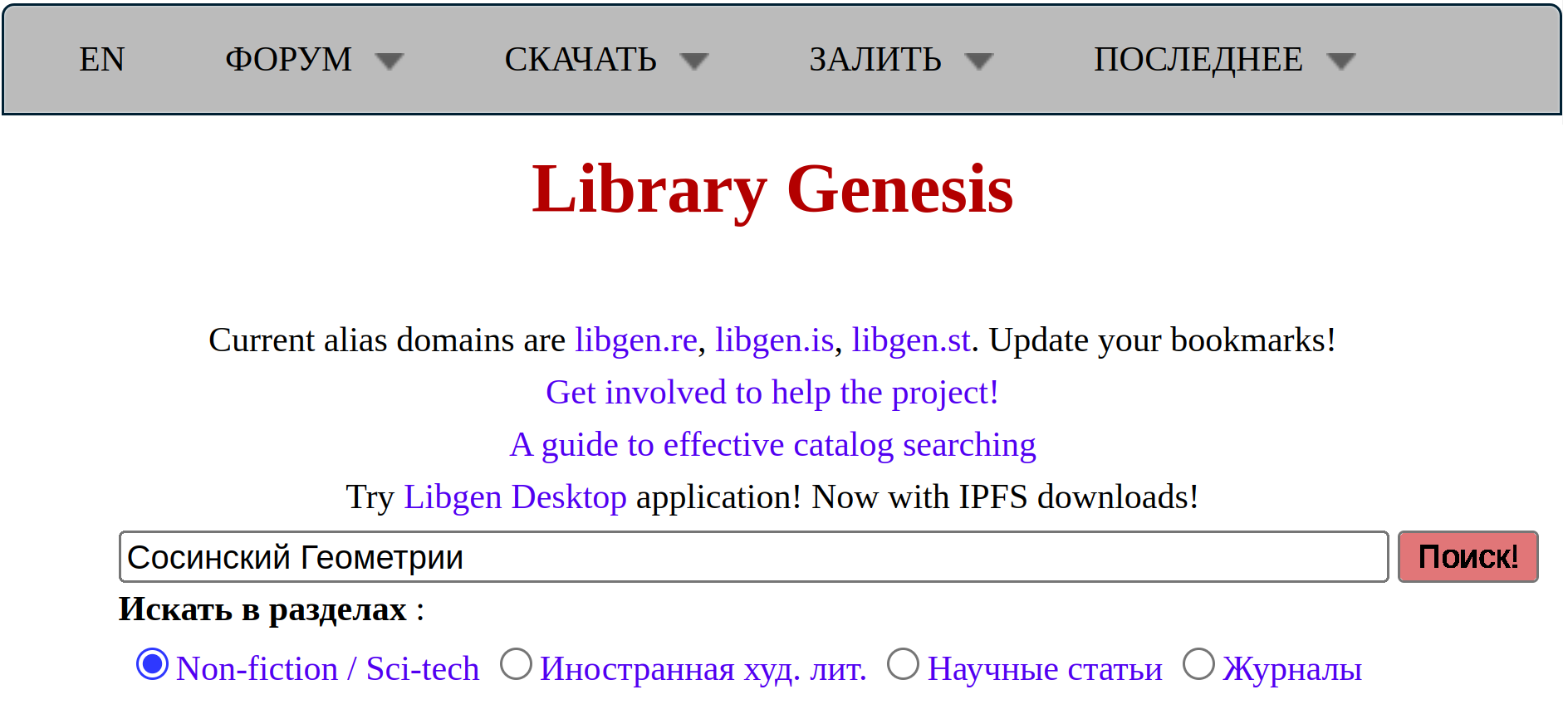 Точный адрес библиотеки постоянно меняется. Список рабочих адресов с наиболее эффективным сервисом обновляется на странице https://librarygenesis.net/. Также вы можете ввести запрос "Libgen" в свою любимую поисковую систему и попробовать найти подходящий сайт, но это сложнее и бывает чуть менее надёжно.