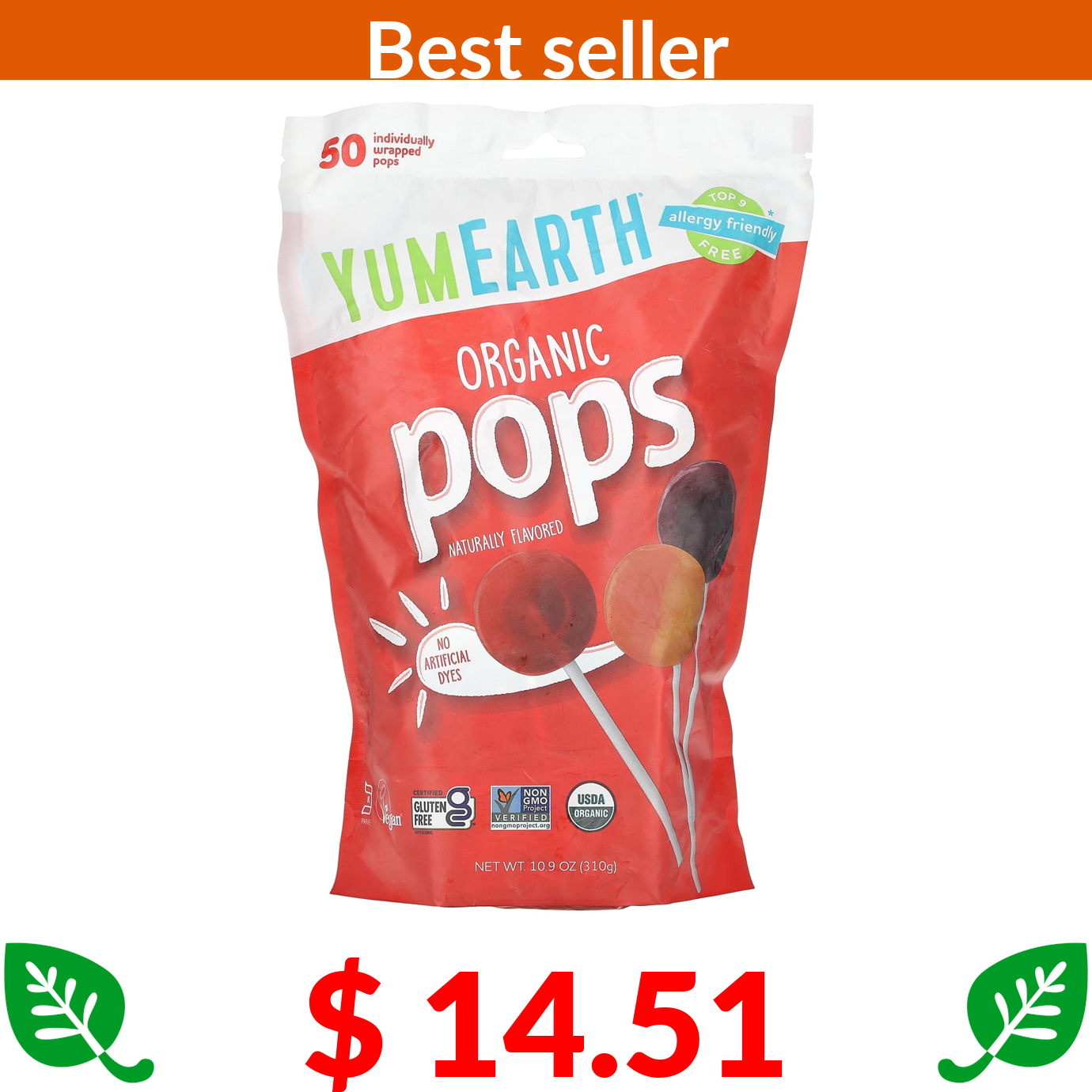 $ 14.51 YumEarth, Organic Pops, Assorted Flavors, 50 Pops, 10.9 oz (310 g)