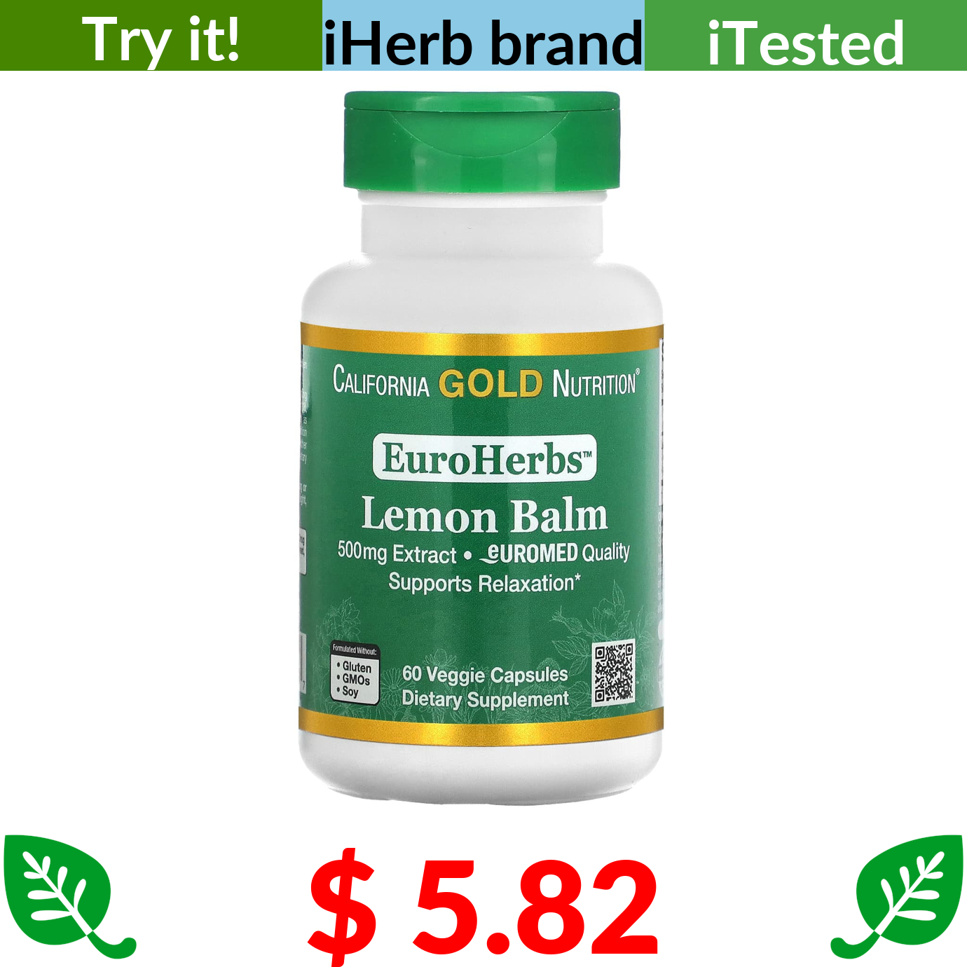 $ 5.82 California Gold Nutrition, EuroHerbs, Lemon Balm Extract, 500 mg, 60 Veggie Capsules