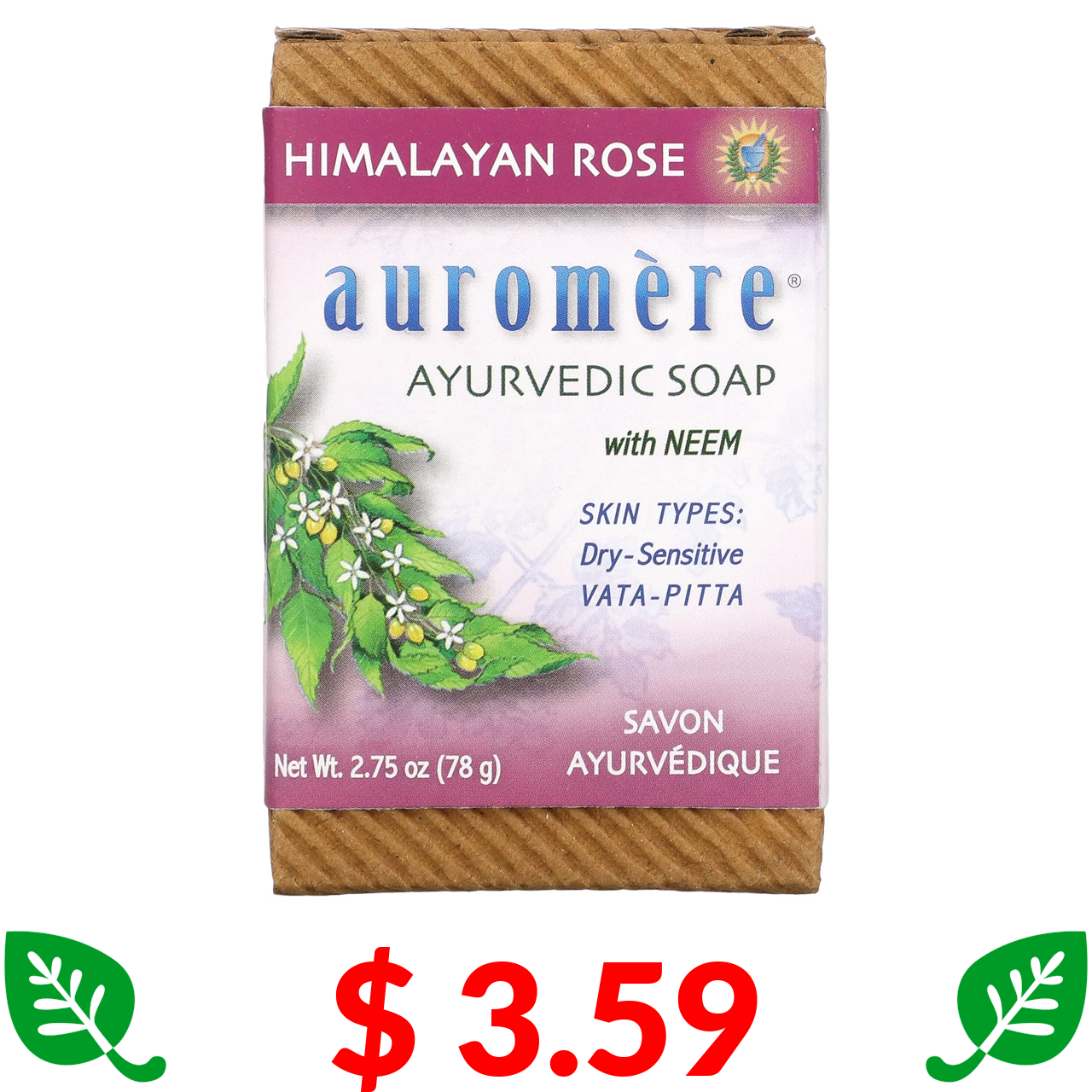 $ 3.59 Auromere, Ayurvedic Bar Soap, With Neem, Himalayan Rose, 2.75 oz (78 g)