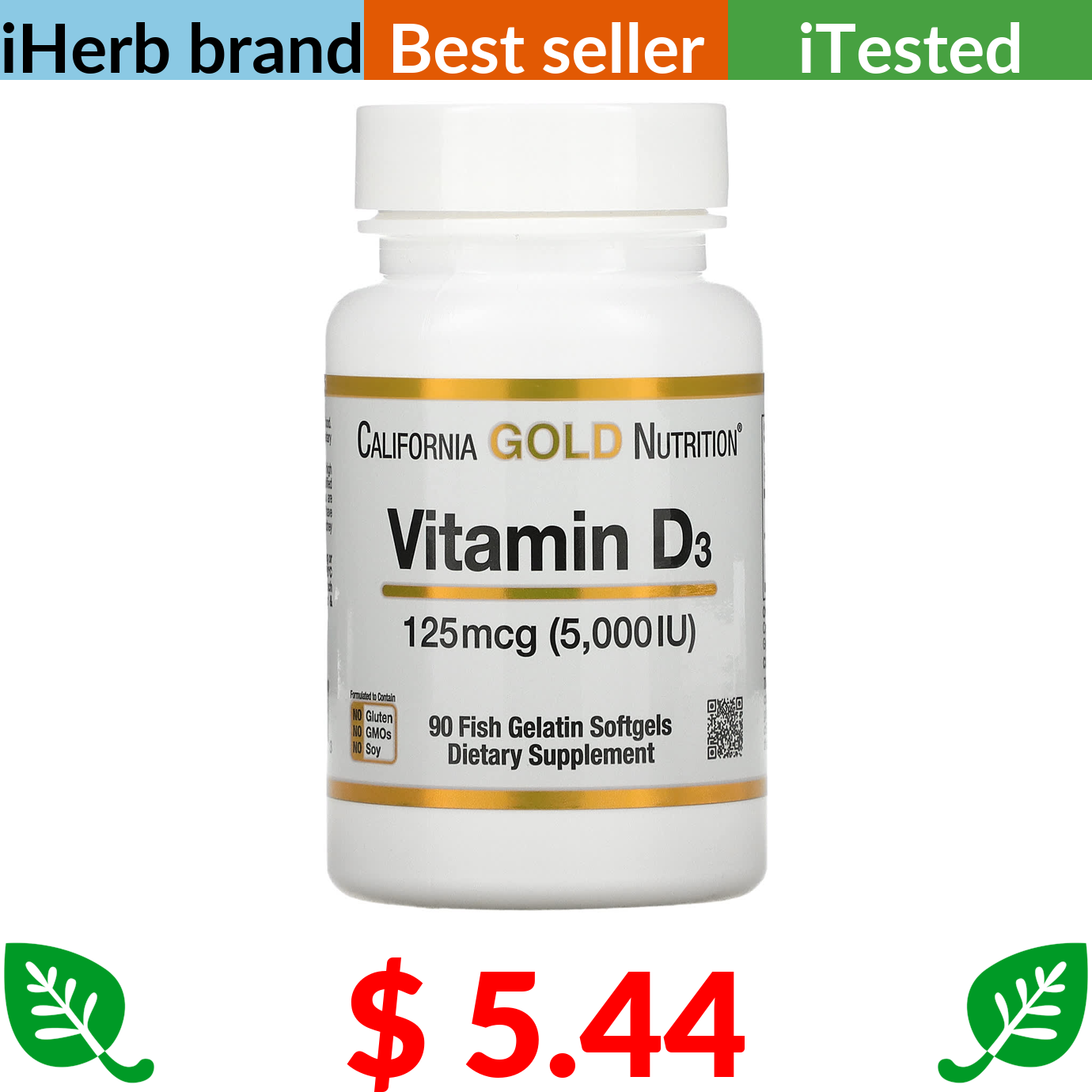 $ 5.44 California Gold Nutrition, Vitamin D3, 125 mcg (5,000 IU), 90 Fish Gelatin Softgels
