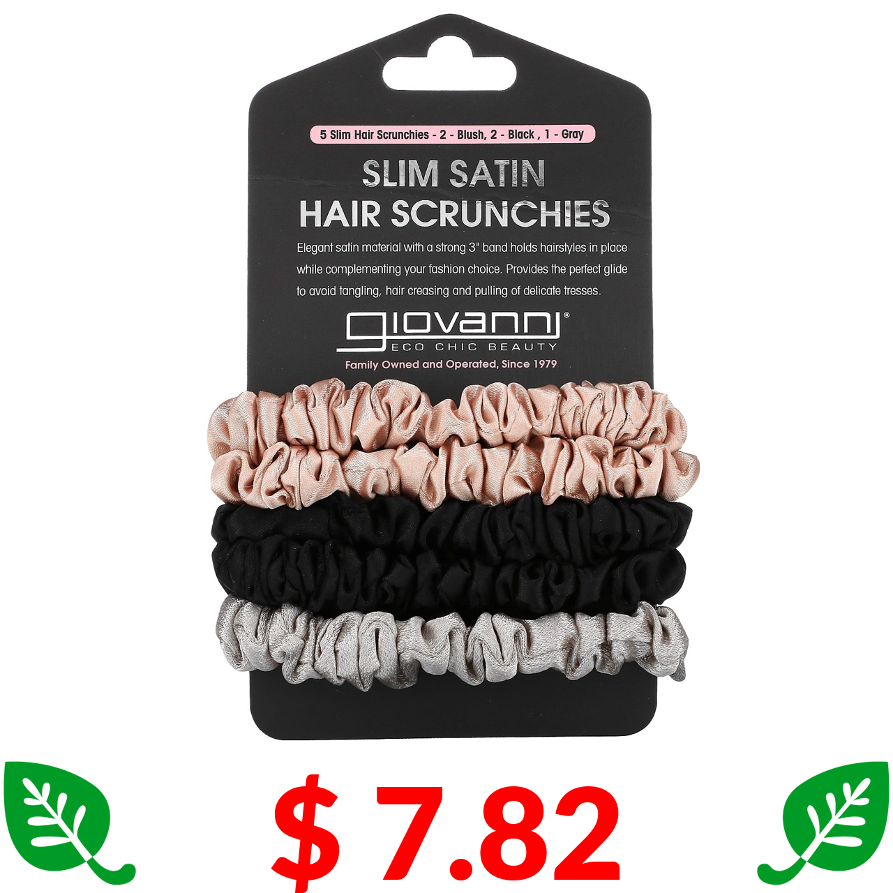 $ 7.82 Giovanni, Slim Satin Hair Scrunchies, Blush, Black, Gray, 5 Scrunchies